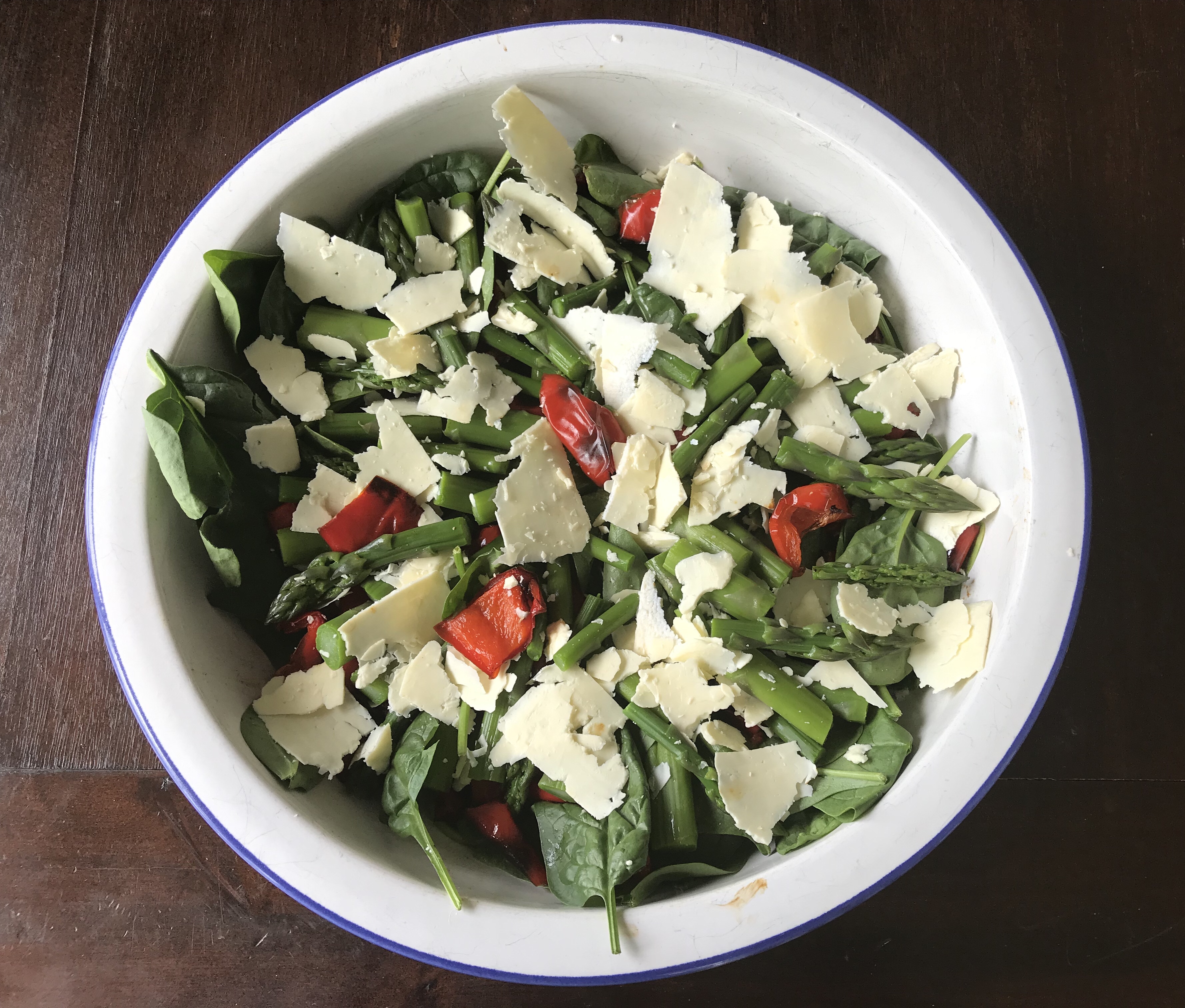 Place salad leaves and cooled pepper in salad bowl. Arrange asparagus spears around the top.