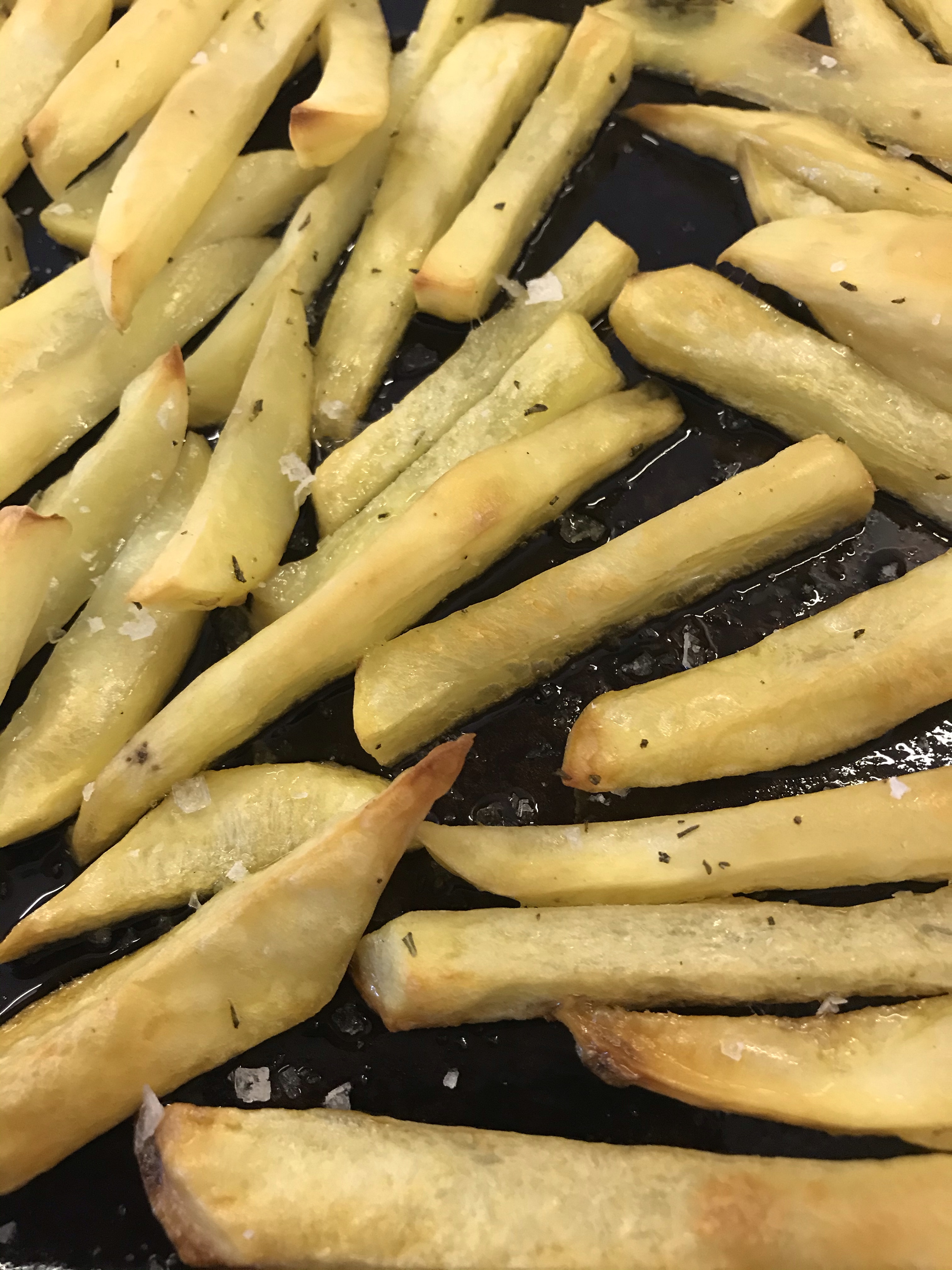 • This will feel scary, but do not stir the chips at all. The oil will stop them from sticking and by leaving them, you get a lovely browned top and crisped bottom where the chips sit on the roasting pan.