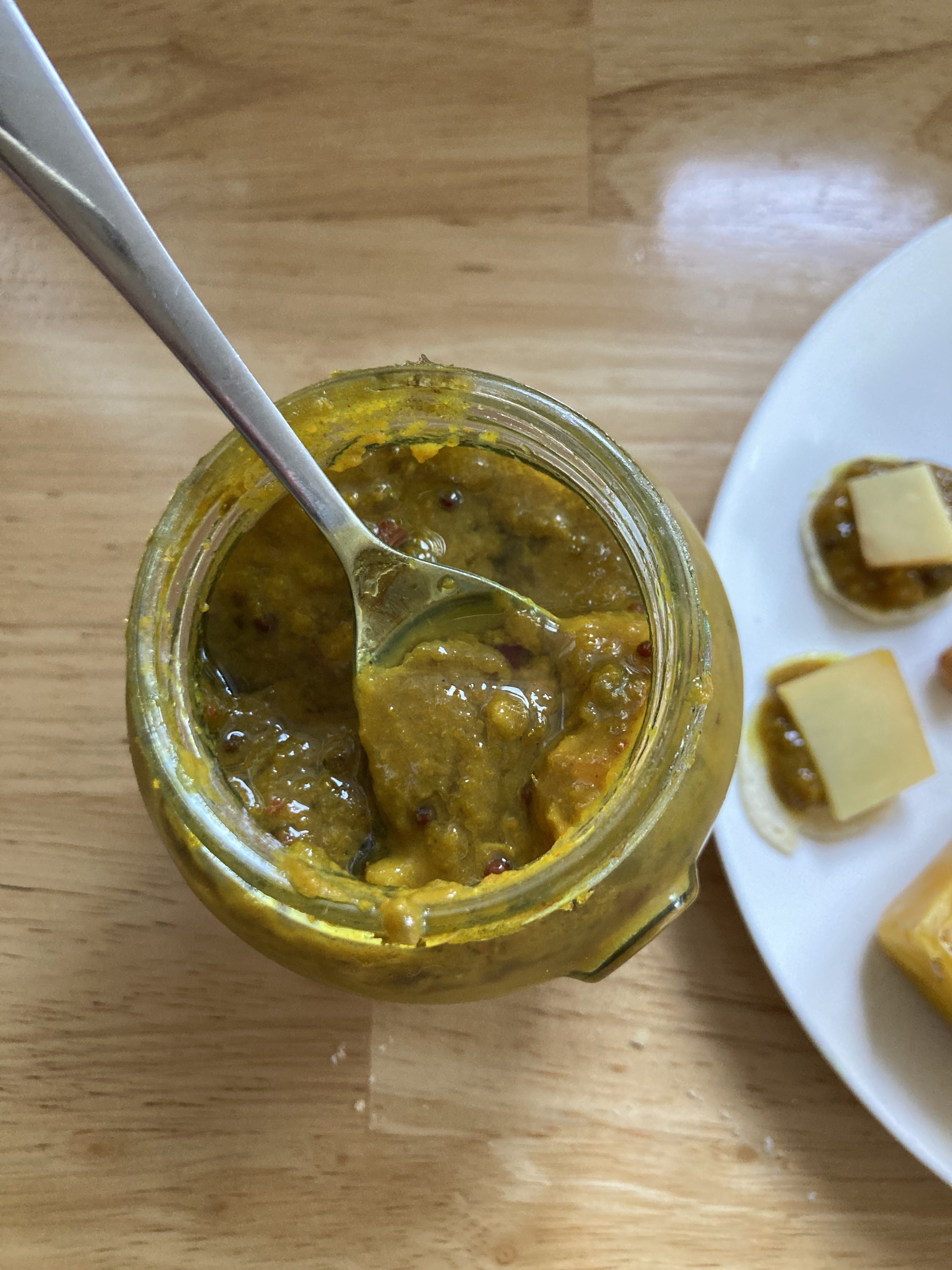 • Add the feijoa mixture to the pot, along with the sugar, mustard seeds and salt, and cook on a low heat, stirring occasionally, until the oil floats on the top (about 30 minutes).