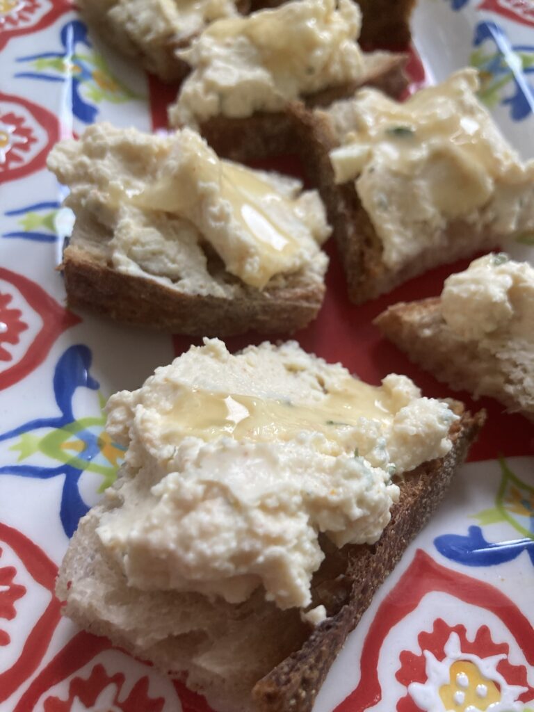 - Something to slather this on – for this recipe I used 3 slices of sourdough, quartered, crackers work too