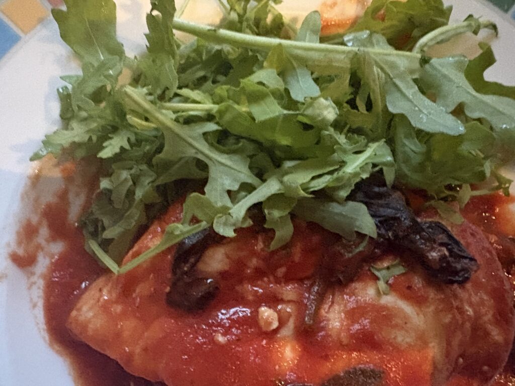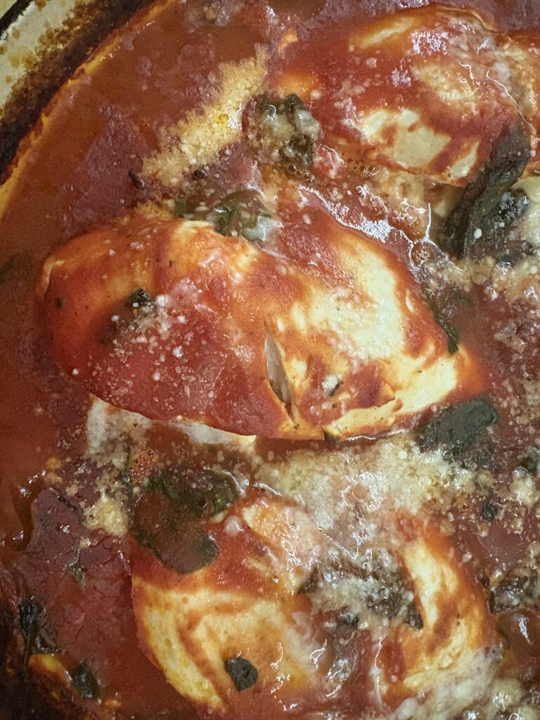 To make it – preheat the oven to 200 degrees centigrade and heat some olive oil in an oven- and stovetop- proof pot or dish.  Add 1-2 cloves of sliced garlic and cook for 30 seconds, then add 2 cups of spinach and cook it down.  Tip in 600mls passata, 150 mls stock or wine, 2 tablespoons of tomato paste, 1/2 teaspoon brown sugar, 1 teaspoon oregano and 1 tablespoon of balsamic vinegar and bring to a simmer.  Meanwhile, cut through the middle of four whole chicken breasts lengthways, nearly in half lengthways, but not quite.  Stuff the gap with feta and cracked pepper. Once the passata mix is bubbling away, nestle the chicken breasts in the pan and bake for 20-25 minutes until the chicken is done.  Top it with Parmesan and a little drizzled balsamic vinegar if you like a slightly sour hit. I find this really filling and don’t tend to need much else with it except some salad, but I reckon some crusty bread would be go well dipped in the sauce to scoop up any escaped feta.