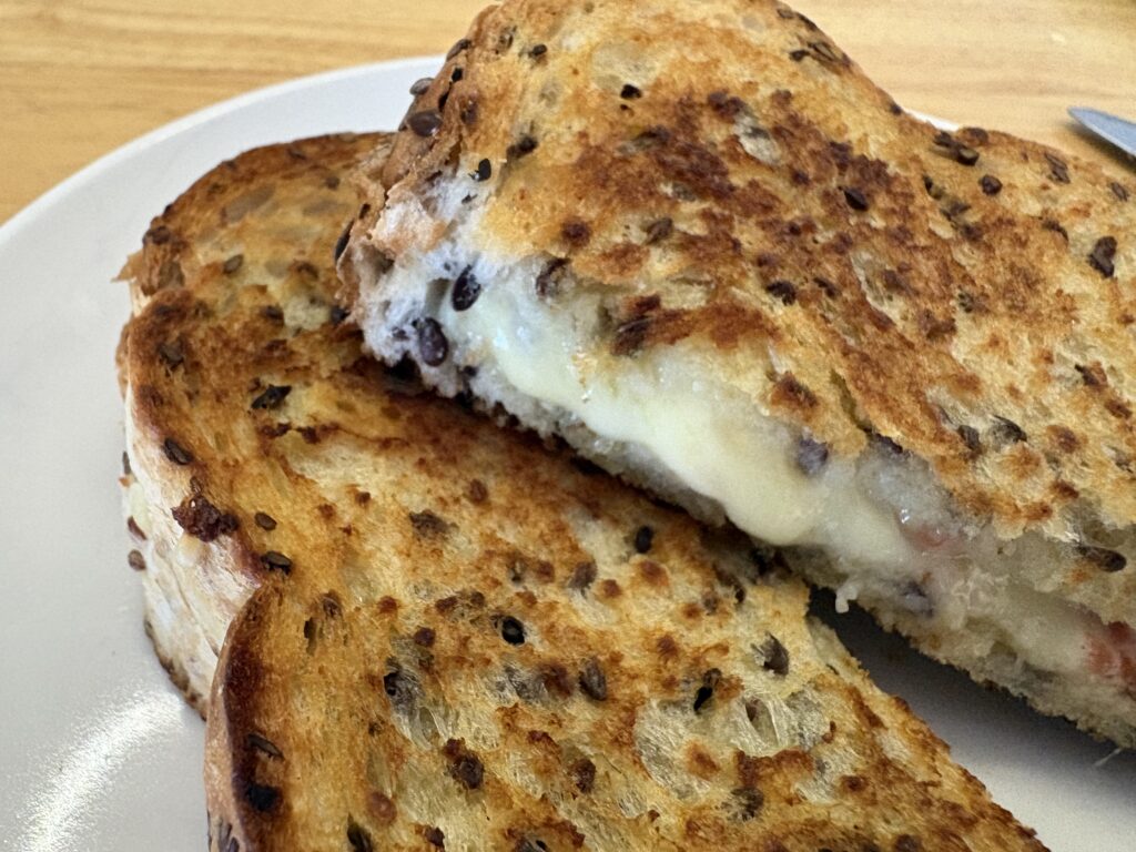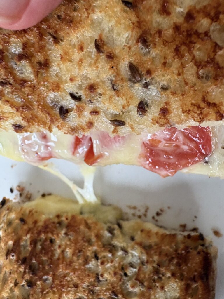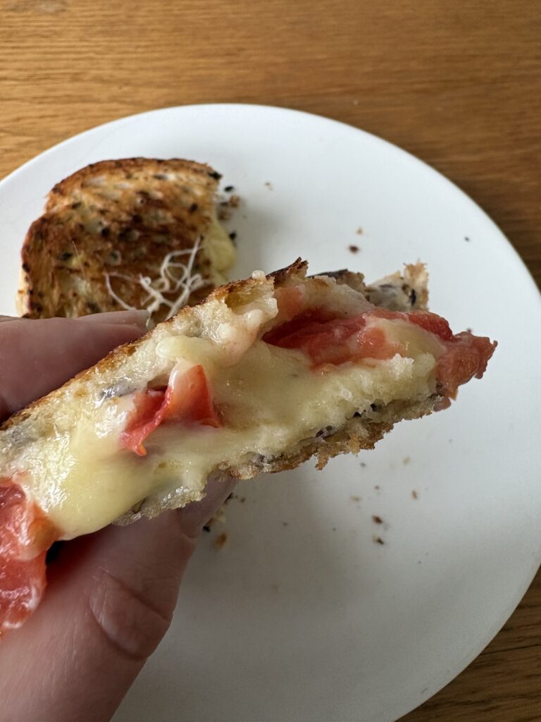 I love a good cheese toastie and this is a respectable vehicle for excess tomatoes.  My new office has a strict no-toasters policy as apparently toasters are major culprits of expensive fire brigade call-outs?  This does mean we have a generous selection of toasted sandwich presses to hand, so I am enjoying cheese toasties with homegrown tomatoes and sliced gherkin.
