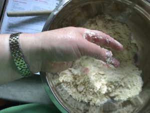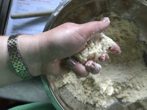 Sift the flour and baking soda. Cut in the butter and rub it around with your fingers until it looks like clumpy breadcrumbs. Add the water, milk and egg and mix quickly until it comes together into a ball.