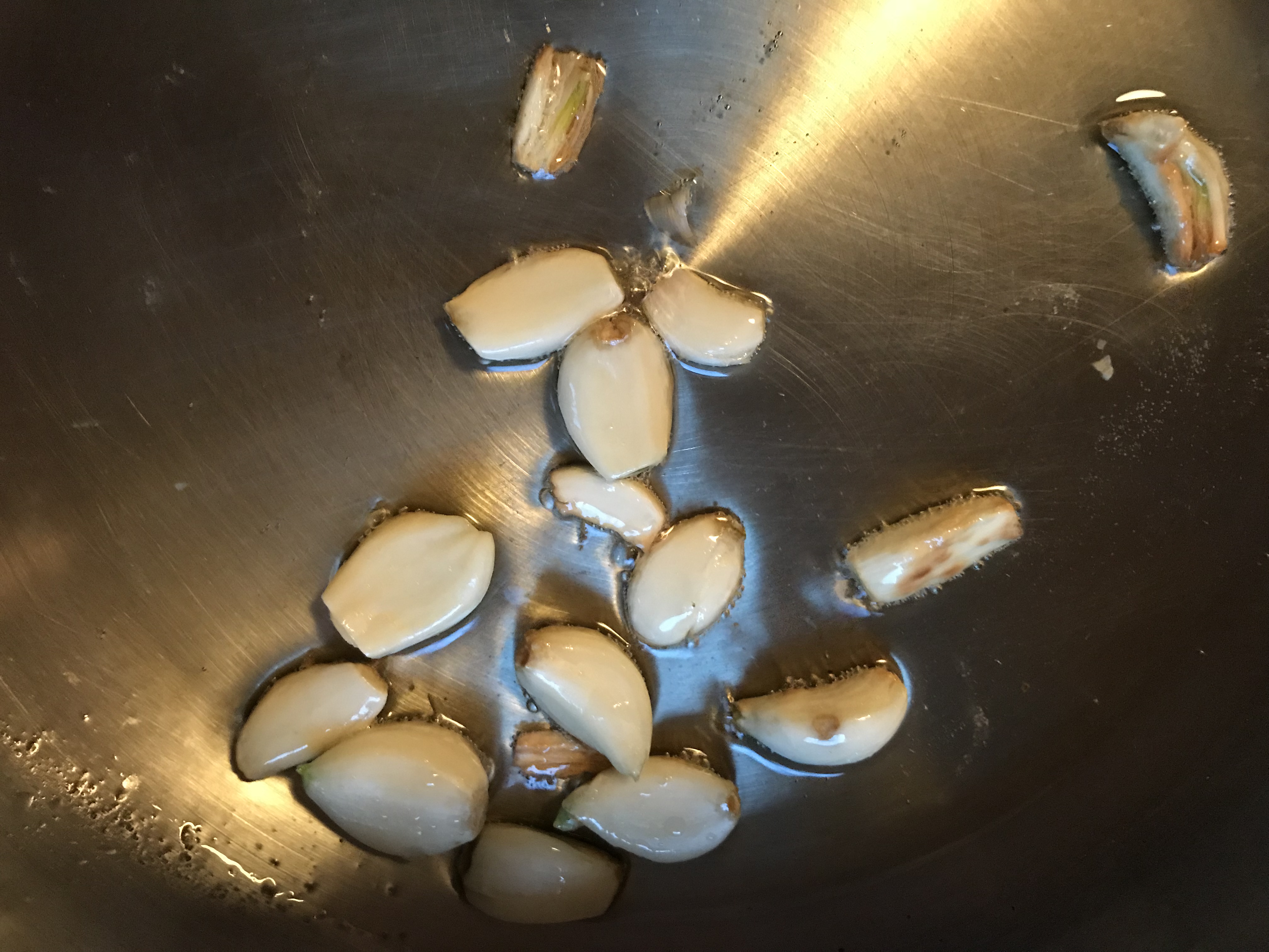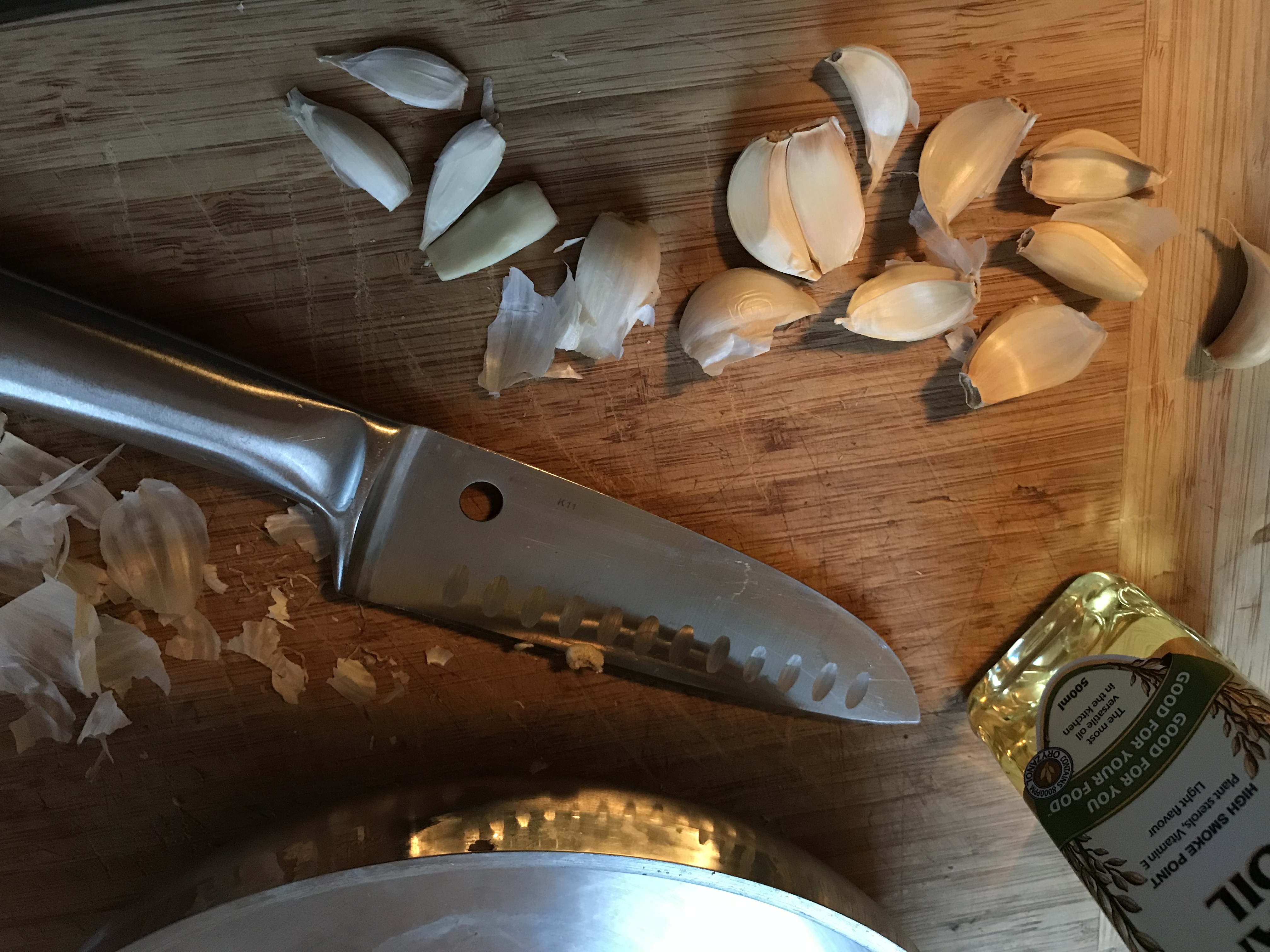 Cut the bottom off your garlic head, remove each clove and peel it. Squash each clove with the flat part of a large knife, so some of the flavour can be released when cooking in the oil.